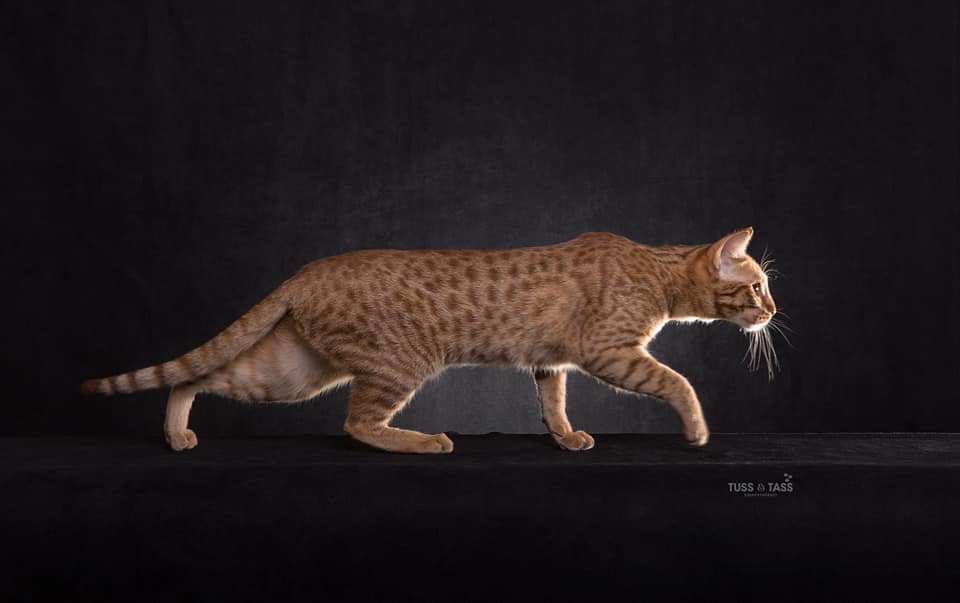 Ocicat är kraftfullt och smidigt byggd, har medellånga, muskulösa ben med ovala, kompakta tassar och lång, medelsmal svans.